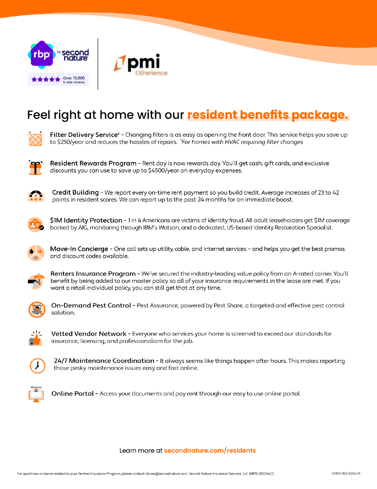 All PMI Experience residents are enrolled in the Resident Benefits Package (RBP) for $65.95/month which includes liability insurance, credit building to help boost the resident’s credit score with timely rent payments, up to $1M Identity Theft Protection, HVAC air filter delivery (for applicable properties), move-in concierge service making utility connection and home service setup a breeze during your move-in, our best-in-class resident rewards program, on-demand pest control, and much more! More details upon application.