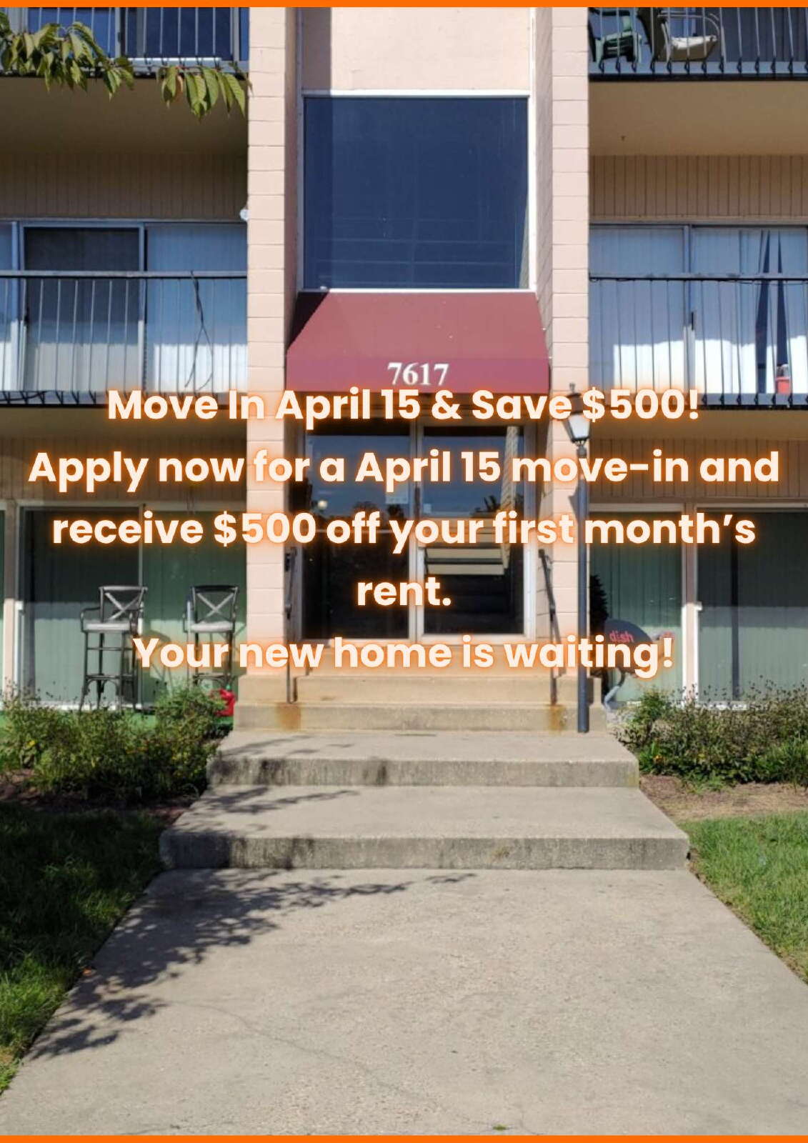 Apply now for a April 15 move-in and receive $500 off your first month’s rent.