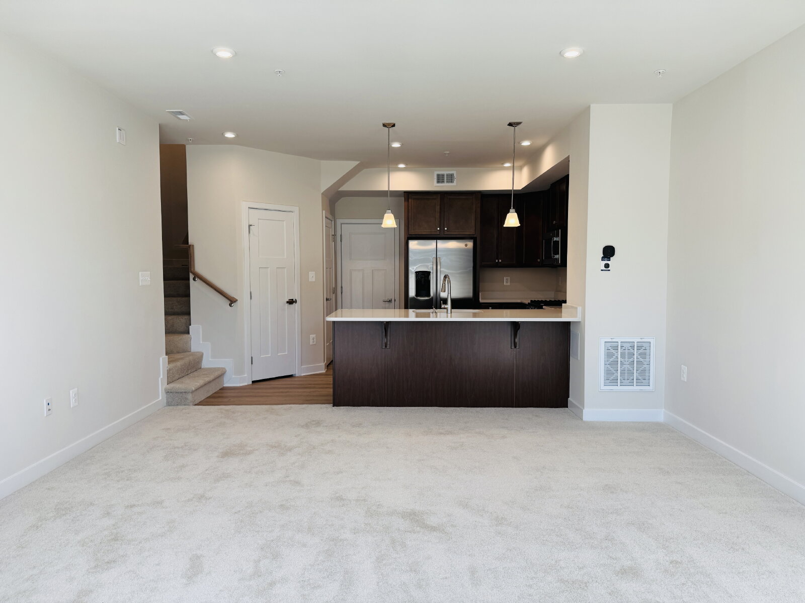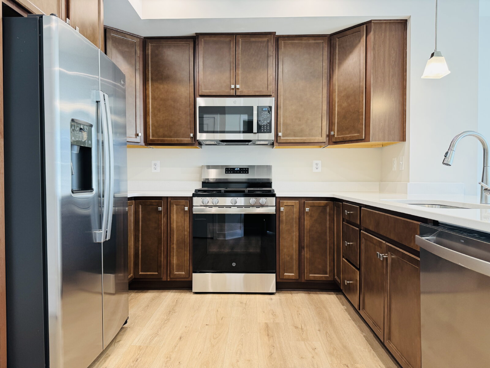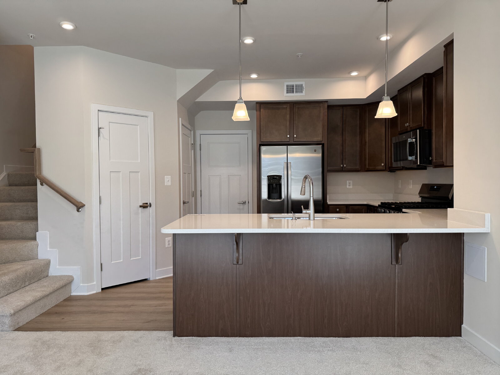 Step into a beautifully designed gourmet kitchen featuring rich dark wood cabinetry, quartz countertops, and sleek stainless steel appliances—including a side-by-side refrigerator with a water dispenser, built-in microwave, gas range, and dishwasher. The open-concept layout flows effortlessly into the living and dining areas, making it ideal for entertaining. Recessed lighting enhances the contemporary feel, while a convenient half-bath adds extra functionality. Plus, enjoy the convenience of a 1-car garage with additional driveway parking.