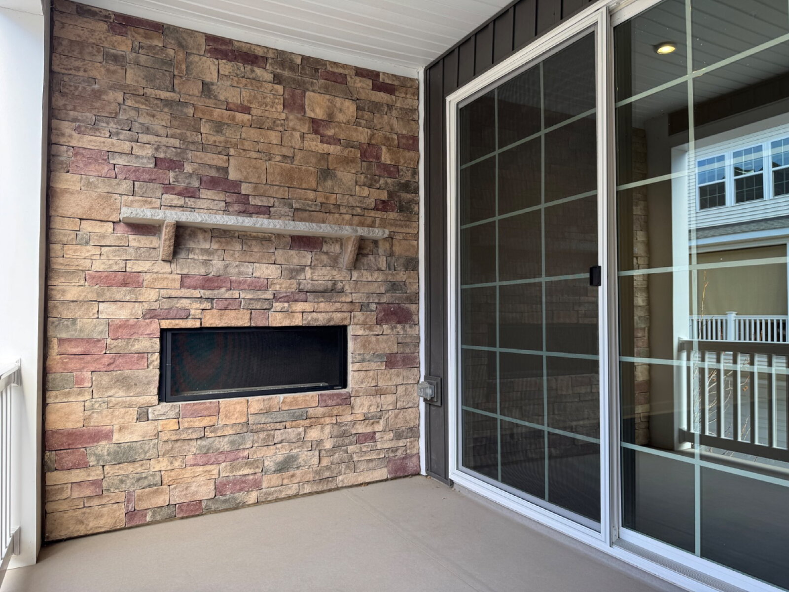 Enjoy a beautifully designed gourmet kitchen showcasing white shaker cabinets, stone countertops, an island, and sleek, energy-efficient stainless-steel appliances— including a side-by-side refrigerator with water dispenser, built-in microwave, gas range, and dishwasher. The open-concept layout connects the kitchen seamlessly with the living and dining areas, perfect for entertaining. Recessed lighting enhances the contemporary ambiance, complemented by a convenient half bath and access to a private deck with a stone fireplace for stylish outdoor relaxation.