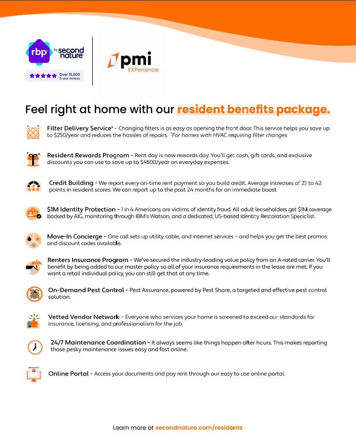 All PMI Experience residents are enrolled in the Resident Benefits Package (RBP) for $65.95/month which includes liability insurance, credit building to help boost the resident’s credit score with timely rent payments, up to $1M Identity Theft Protection, HVAC air filter delivery (for applicable properties), move-in concierge service making utility connection and home service setup a breeze during your move-in, our best-in-class resident rewards program, on-demand pest control, and much more! More details upon application.